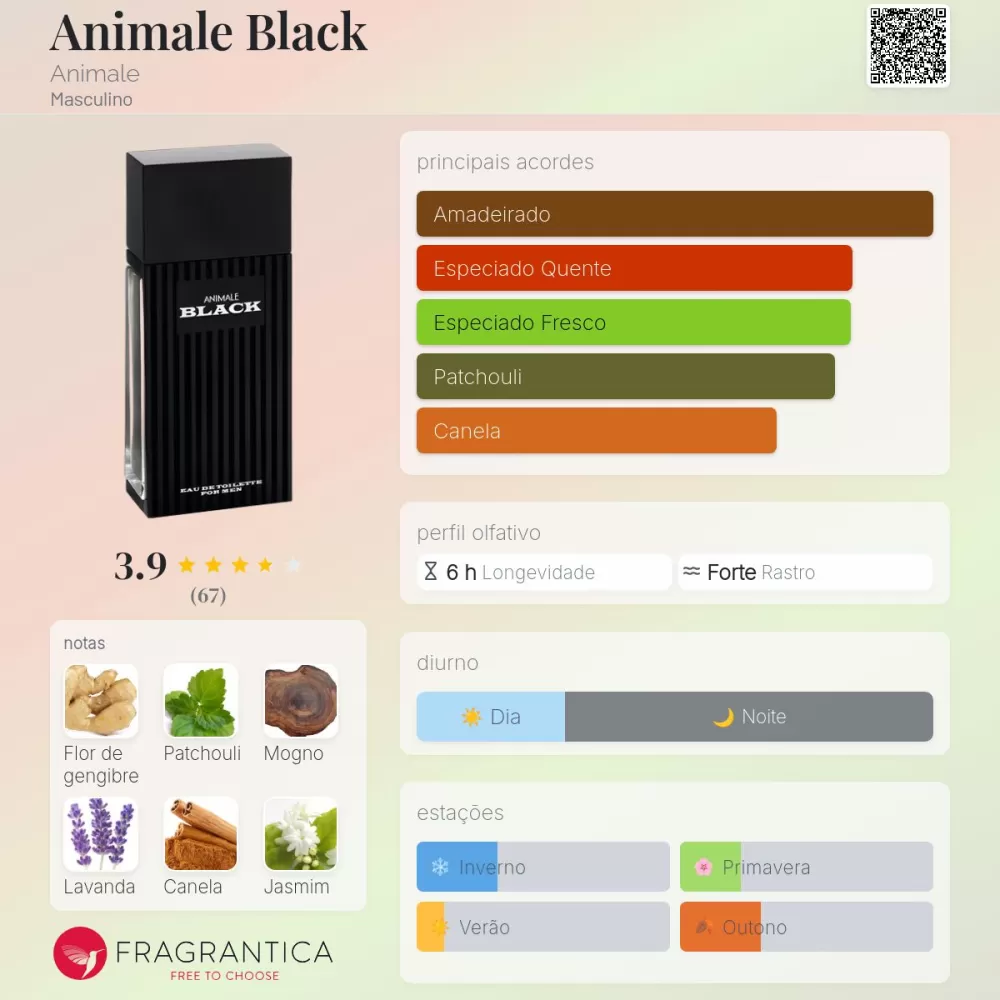 Animale Black é uma fragrância masculina intensa e sofisticada, lançada como uma versão mais moderna e ousada do clássico Animale For Men.