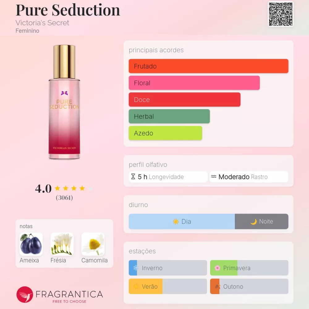 Perfume jovem e alegre, ótimo para quem quer uma fragrância doce e frutada, leve e fácil de usar.